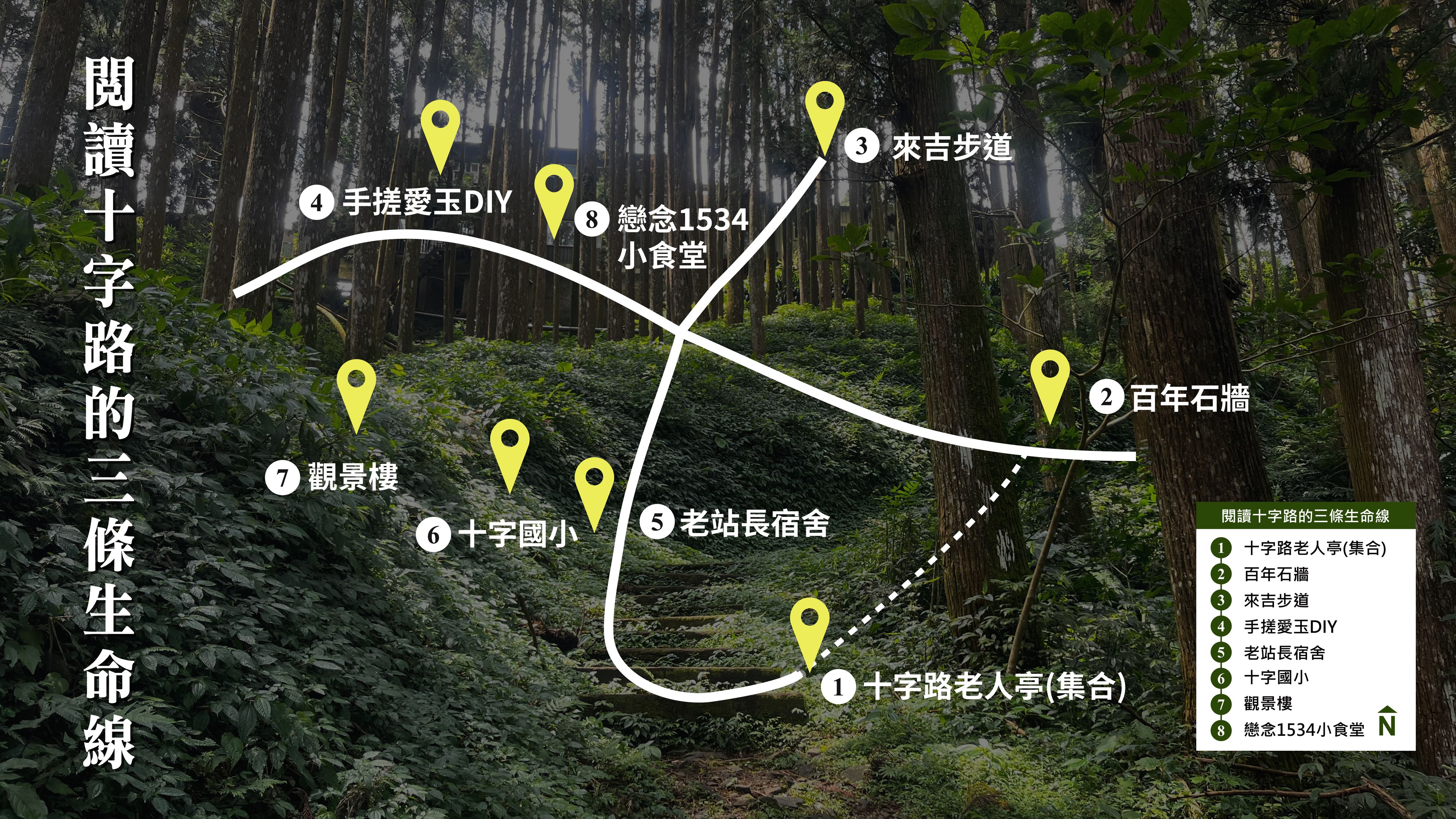 十字路老人亭(集合)➡︎ 十字路步道➡︎ 老站長宿舍➡︎ 觀景台➡︎ 十字國小➡來吉步道➡︎ 手搓爱玉DIY➡︎ 戀念1534小食堂(三兄妹便當)享用特色包布便當(結束)